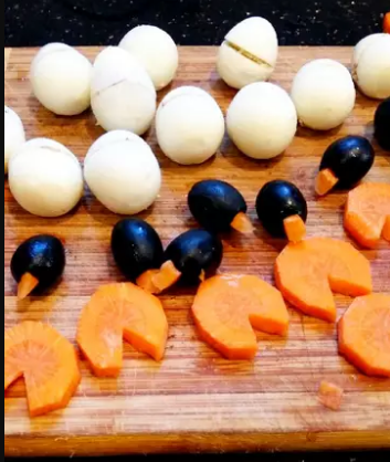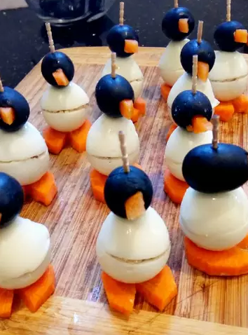 Нарежьте морковь на толстые кружочки, вырезав небольшой треугольник, это будет «клювик» и «ноги». Клювики немного подрезать и вставить в отверстие маслины.