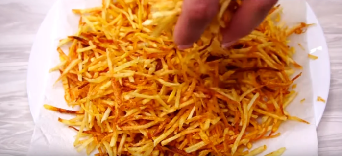 На сковороду наливаем растительное масло и обжариваем картофель не большими порциями до золотистого цвета.