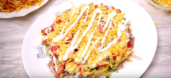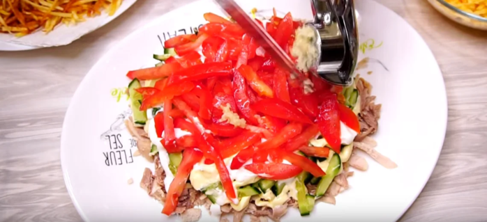 Теперь повторяем все слои: мясо, огурцы, помидоры, чеснок, соль, черный перец, сыр. Сои не нужно утрамбовывать они должны быть воздушными. Смазываем сверху майонезом.
