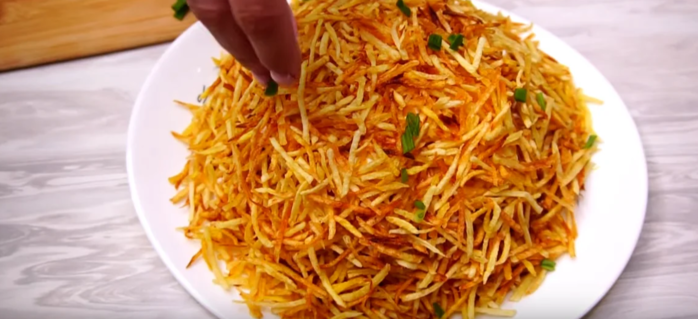 Сверху посыпаем жаренным картофелем, украшаем зеленью.