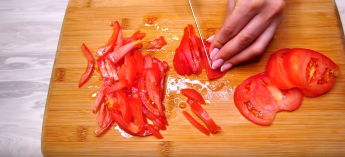 Свежие огурцы и помидоры нарежем брусочками. Помидоры кладем на дуршлаг и дадим стечь образовавшемуся соку. Сыр 100 грамм натрем на крупной терке.