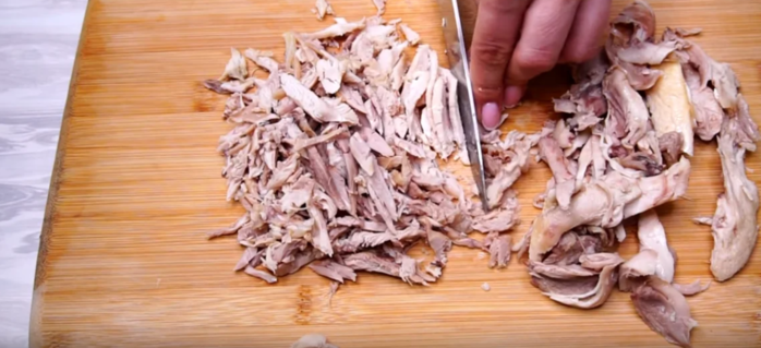 Первым слоем кладем половину куриного мясо, сверху смазываем майонезом.