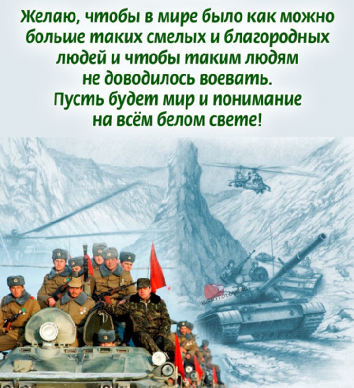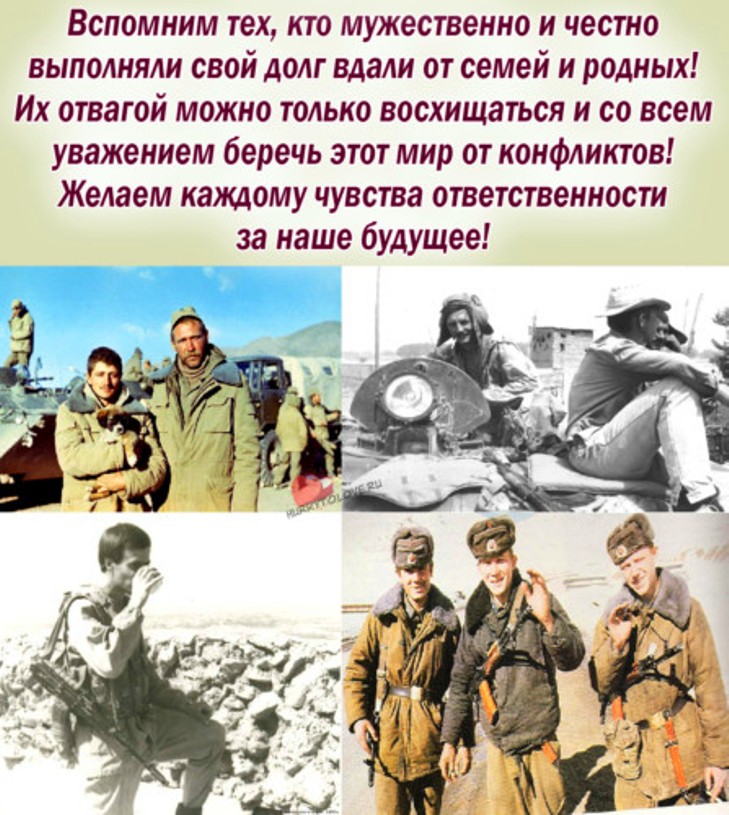 15 февраля 1989 года завершился вывод советских войск из Афганистана. В память о героическом подвиге наших военных, и отдавая дань уважения их подвигу, в память о более 14 тысячах советских солдат и офицеров, не вернувшихся с афганской войны, 15 февраля считается в России Днем памяти воинов-интернационалистов.