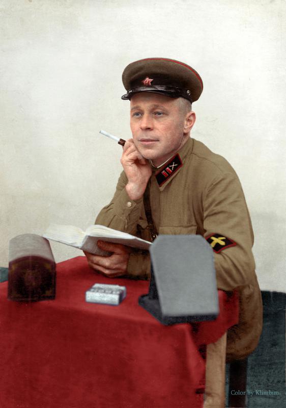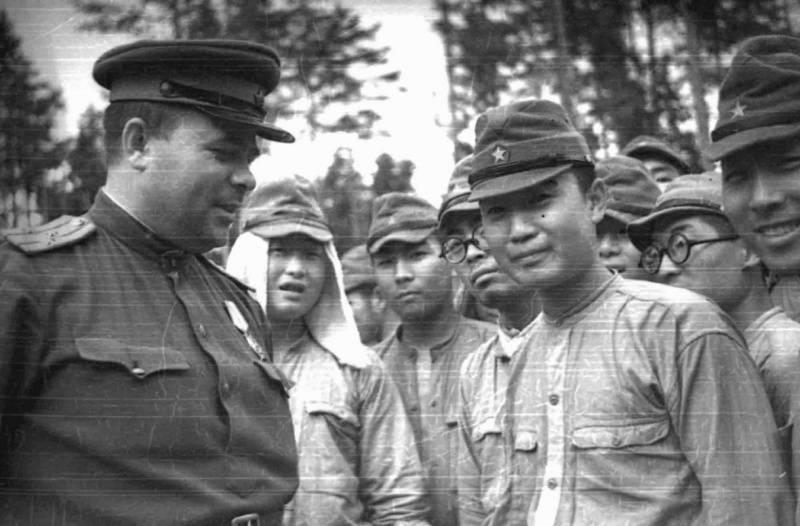 Полковник РККА с капитулировавшими солдатами 88-й японской дивизии в районе Котона. Август, 1945 г.
