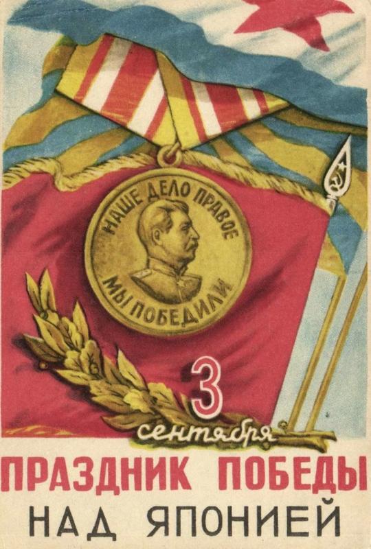 3 сентября 1945 года советская пресса опубликовала обращение Сталина к народу. Там говорилось об окончании войны с Японией. Советский вождь отмечал, что у нашей державы был «особый счёт к Японии». Мы отомстили за поражение в Русско-японской войне 1904—1905 гг., которое «легло на нашу страну чёрным пятном». Сорок лет русские люди ждали справедливого отмщения. И вот этот день наступил. Мы вернули Южный Сахалин и Курильские острова, получили свободный выход в океан. Мы взяли реванш за японскую интервенцию 1918—1922 гг., когда японцы напали на Россию, оккупировали Дальний Восток, четыре года терзали и грабили наш народ. В 1938 и 1939 гг. Япония снова атаковала СССР в районе озера Хасан и в Монголии. Японское руководство планировало перерезать Сибирскую железную дорогу и захватить Дальний Восток. Теперь агрессор уничтожен.