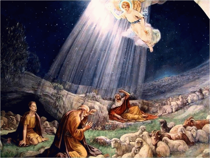 В тот момент, когда родился Христос, ангел Божий явился с радостной вестью местным пастухам. При виде посланника Божия те испугались, однако он сказал им: «Не бойтесь; я возвещаю вам великую радость, которая будет всем людям: ибо ныне родился вам в городе Давидовом Спаситель, Который есть Христос Господь; и вот вам знак: вы найдете Младенца в пеленах, лежащего в яслях».