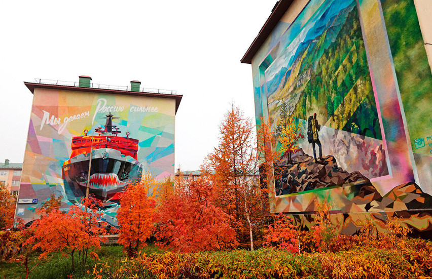 Во многих городах, расположенных на Крайнем Севере, есть традиция раскрашивать многоквартирные дома в яркие цвета, это улучшает видимость построек на белом заснеженном фоне. Еще одной причиной является «цветовое голодание». В этих регионах преобладает бело-серая цветовая гамма, что удручающе действует на эмоциональное состояние людей. Там, где не хватает солнца и растительности, оранжевые, желтый и розовые здания помогают поднять настроение. Как можно грустить в таком буйстве красок? Только посмотрите на эти великолепные граффити в Салехарде!