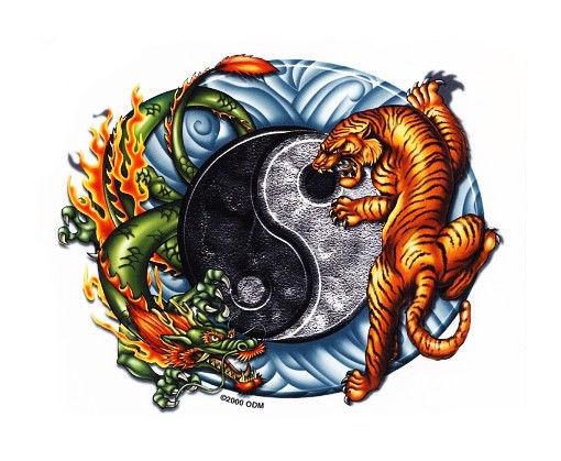* Символ Дао порой изображает вместо черной и белой капель лазурного дракона, символизирующего небесное, духовное и огненного тигра, символизирующего земное, реализационное, замкнутых в круг,. В частности, такой символ используется как эмблема восточных боевых искусств.