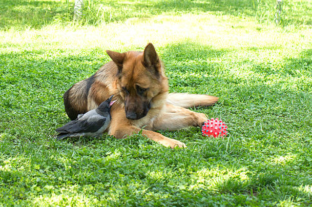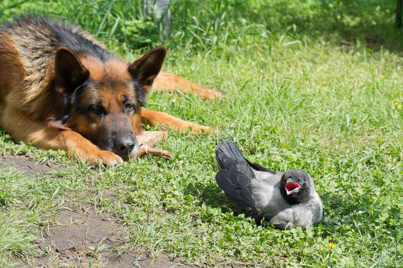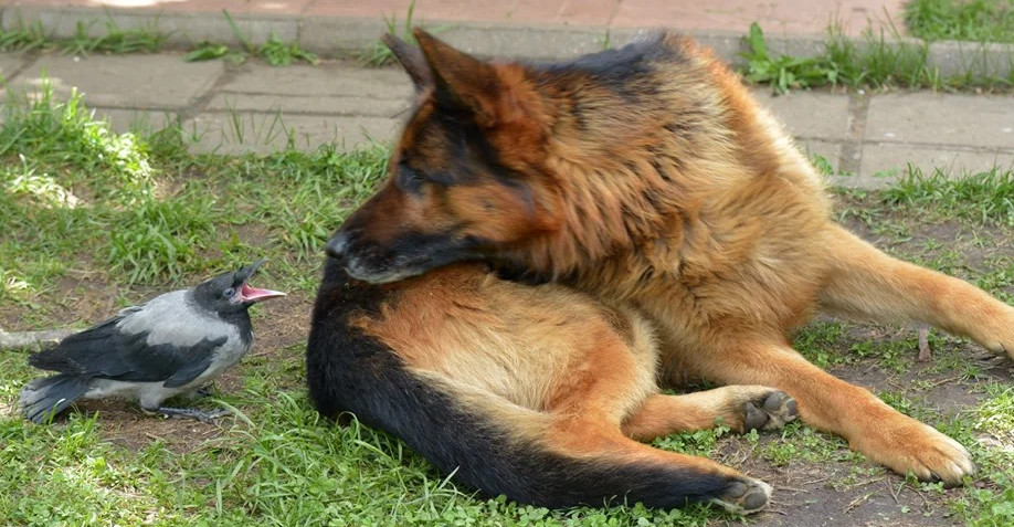 Потом подросший воронёнок стал тягать огромную овчарку за хвост. Просто впивался в него клювом и пытался потащить по полу. Это вытерпеть было совершенно невозможно.