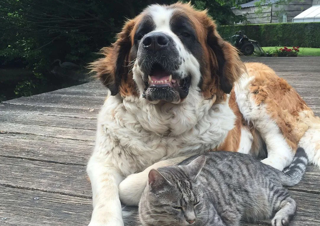 Огромный сенбернар по кличке Пуся и его друг серый кот Мулик сидели и смотрели на него во все глаза.