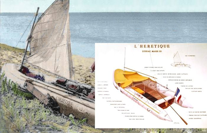 Свою лодку он назвал «Еретик». Это была туго накачанная резиновая плоскодонка длиной 4 м 65 см и шириной 1 м 90 см с деревянной кормой и легким деревянным настилом на дне. Двигался «Еретик» при помощи четырехугольного паруса.