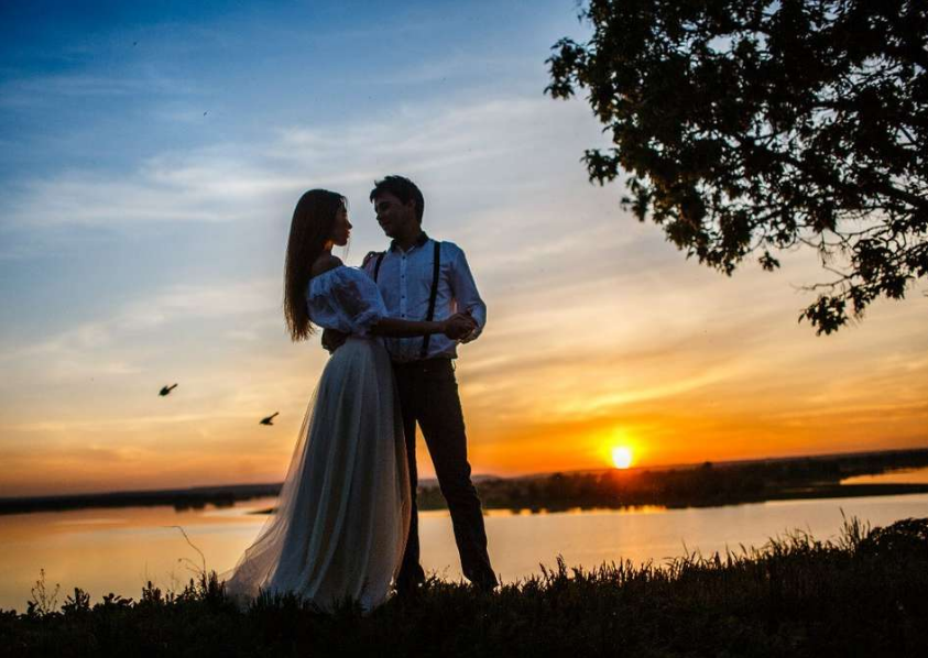 Вот потупив глаза, она подставляет ему свои губы для поцелуя, под дружный крик «Горько!».
