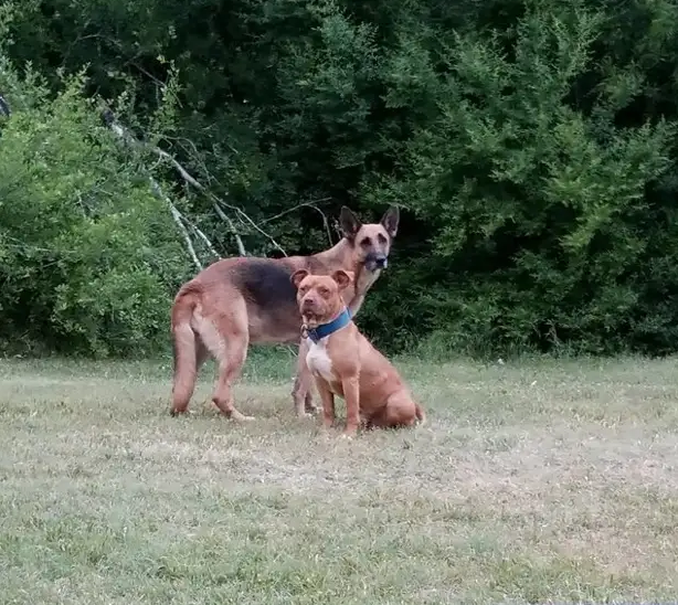 Как только женщина подошла к овчарке, та попятилась назад, а затем ненадолго скрылась в лесу. А вернулась она уже не одна! Рядом с собакой испуганно топтался питбуль…