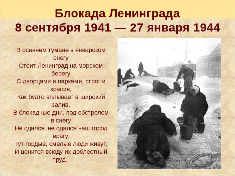 Военная блокада города Ленинграда немецкими, финскими и испанскими войсками с участием добровольцев из Северной Африки, Европы и военно-морских сил Италии во время Великой Отечественной войны, длилась с 8 сентября 1941 года по 27 января 1944 года - 872 дня!