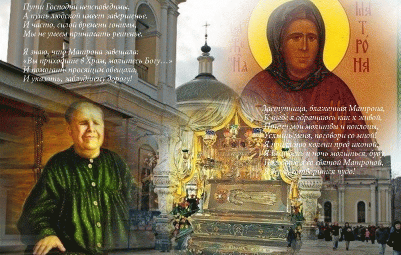 О блаженная мати Матроно, душею на небеси пред Престолом Божиим предстоящи, телом же на земли почивающи, и данною ти свыше благодатию различныя чудеса источающи. Призри ныне милостивным твоим оком на ны, грешныя, в скорбех, болезнех и греховных искушениих дни своя иждивающия, утеши ны, отчаянныя, исцели недуги наши лютыя, от Бога нам по грехом нашим попущаемыя, избави нас от многих бед и обстояний, умоли Господа нашего Иисуса Христа простити нам вся наша согрешения, беззакония и грехопадения, имиже мы от юности нашея даже до настоящаго дне и часа согрешихом, да твоими молитвами получивше благодать и велию милость, прославим в Троице Единаго Бога, Отца, и Сына, и Святаго Духа, ныне и присно и во веки веков.