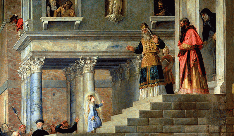 Родители Девы Марии, праведные Иоаким и Анна, молясь о разрешении неплодства, дали обет о том, что если родится дитя, то посвятить его на служение Богу. Когда Пресвятой Деве исполнилось три года, святые родители решили выполнить свое обещание.