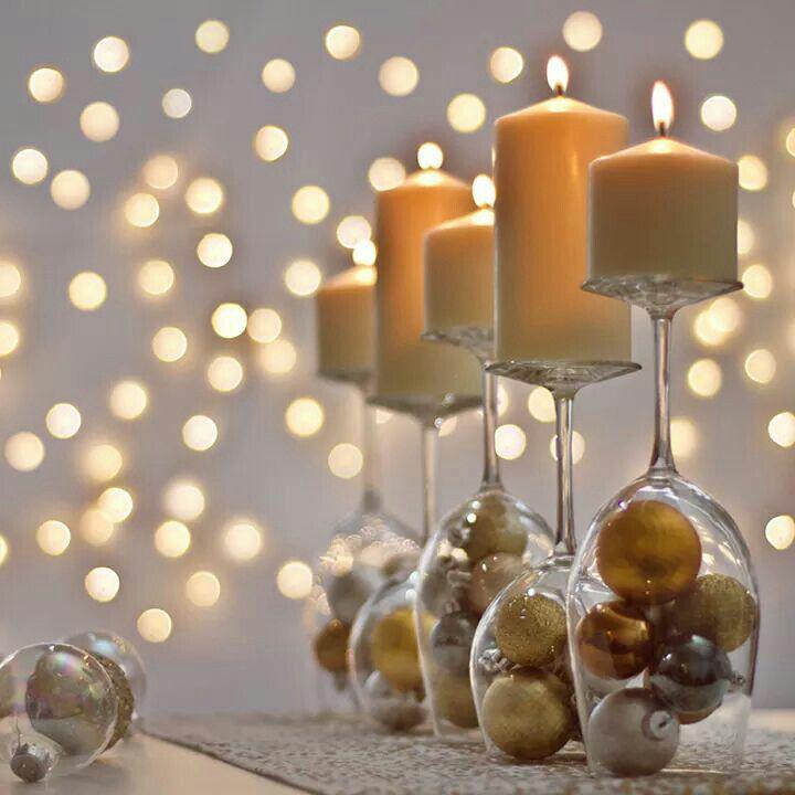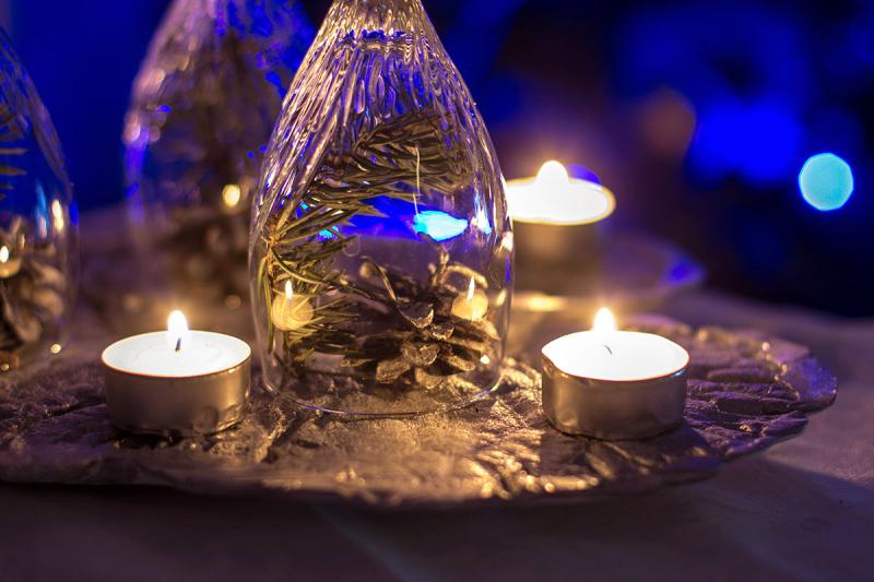 Для украшения на стол, помимо самих блюд, часто ставят различные фигурки, свечи, кладут игрушки и т.д. Если у вас нет больших красивых подсвечников, то сделать их можно из обычных бокалов, просто перевернув их и в каждый бокал положив веточку (можно – зелени, ёлочную и любую другую), или елочные игрушки, а сверху на основание бокалов поставить свечи.