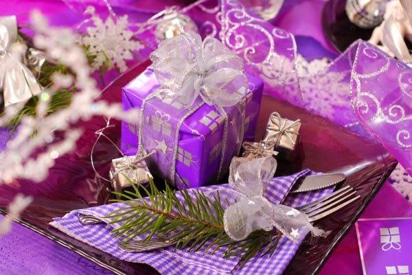 Всегда выигрышно на столе смотрятся яркие салфетки и мишура. На фото – интересная идея: можно свернуть салфетки в кулёчки, положить в них ёлочные игрушки, связать кулёчки лентой, под которую положить еловую веточку. Очень красиво, особенно если оформлять все в единой цветовой гамме, как на фото.