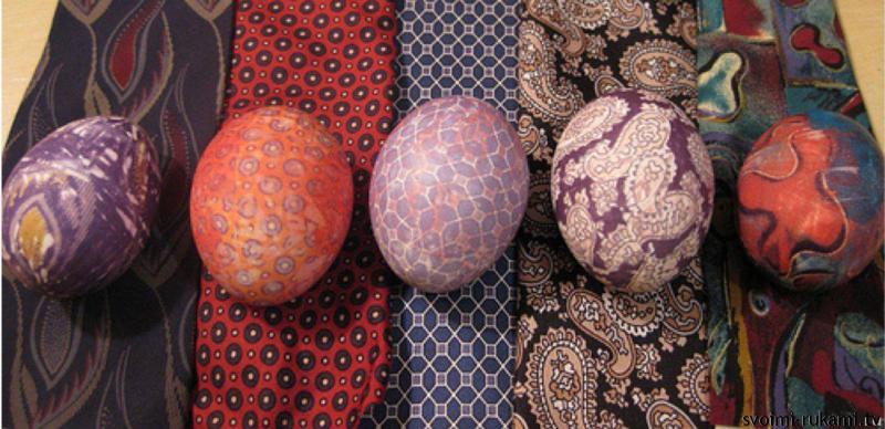 Лоскутки шелковой линючей материи разных цветов расщипать, смешать. Яйца вымыть, вытереть досуха, смочить, обернуть шелком, при желании можно предварительно наложить на яйца вырезанную узорами тонкую, плотную бумагу.Обернуть ветошью, перевязать ниткой, опустить в теплую воду, дать закипеть и варить 10 мин. Затем вынуть, остудить, снять ветошь и шелк. (Можно использовать для окраски старые мужские галстуки)
