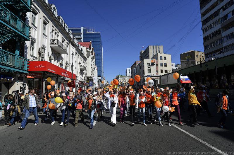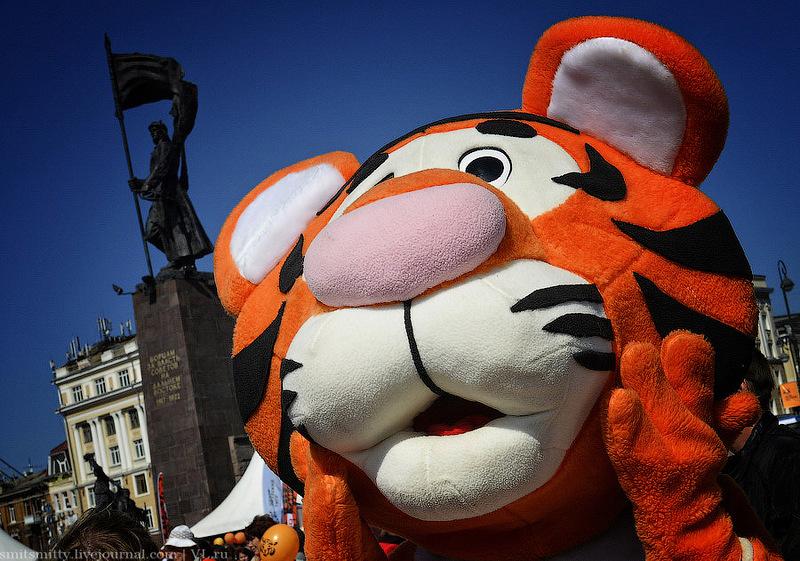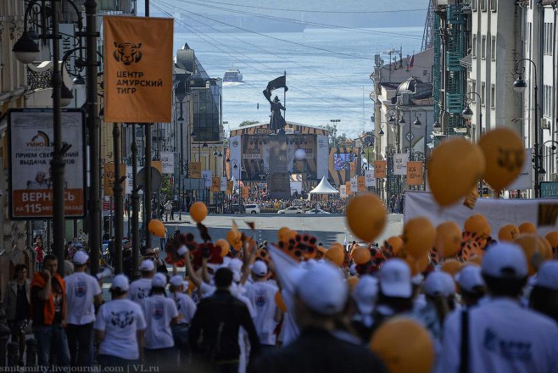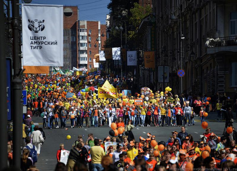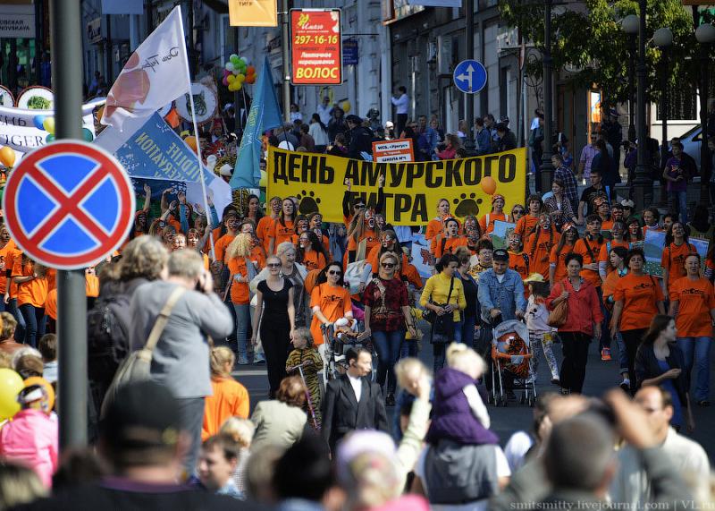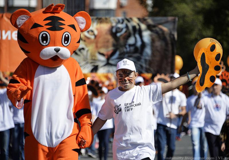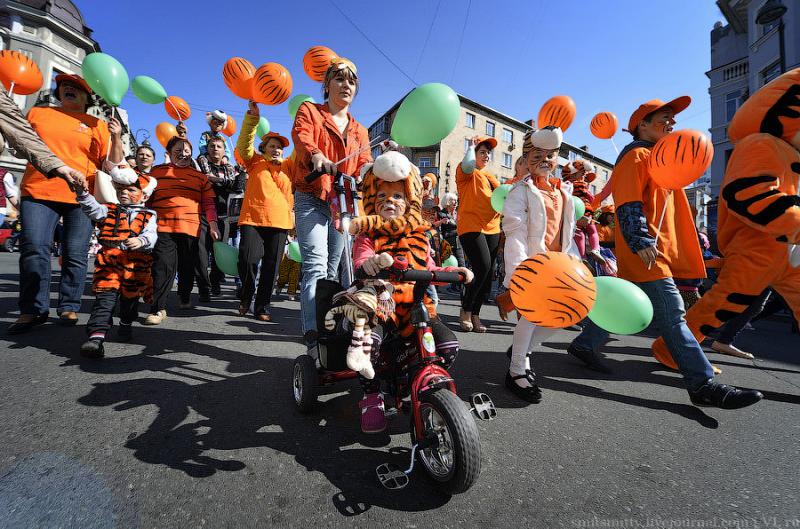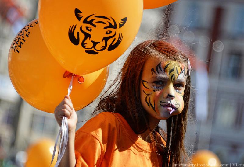 Любимая шутка жителей Владивостока о том, что у нас по городу бродят тигры раз в году, это и не шутка вовсе – ходят, бегают, прыгают, поют и танцуют и не только “тигры”, но и “леопарды”, “лисички” и даже “панды” встречаются, потому что в городе отмечают День Тигра. У нас этот праздник стали отмечать гораздо раньше, чем в мире. День Тигра в виде шумного и весёлого карнавала, проходит во Владивостоке уже почти 20 лет лет.