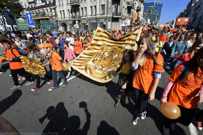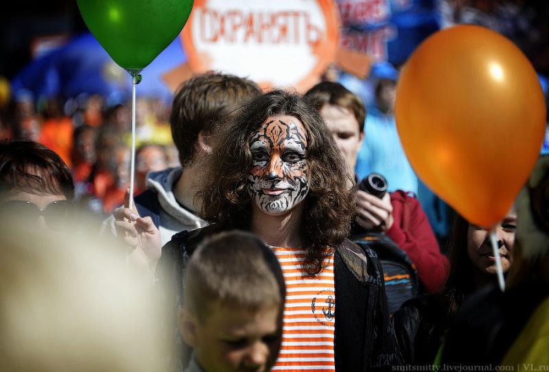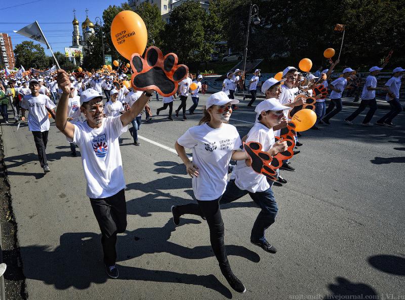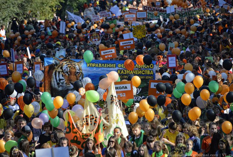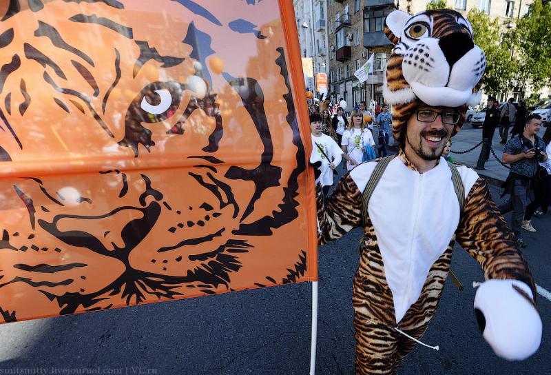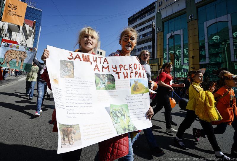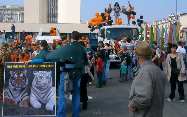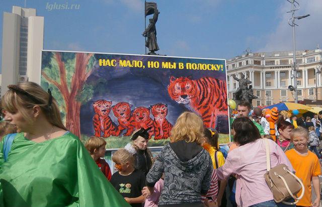 И сегодня, уже в который раз, символ города Владивостока и Приморского края опять стал героем дня, в его честь в городе прошёл “тигриный карнавал”. Тысячи детей и взрослых прошли весёлым шествием по улицам города с плакатами, речёвками, кричалками в защиту природы и всей таёжной фауны