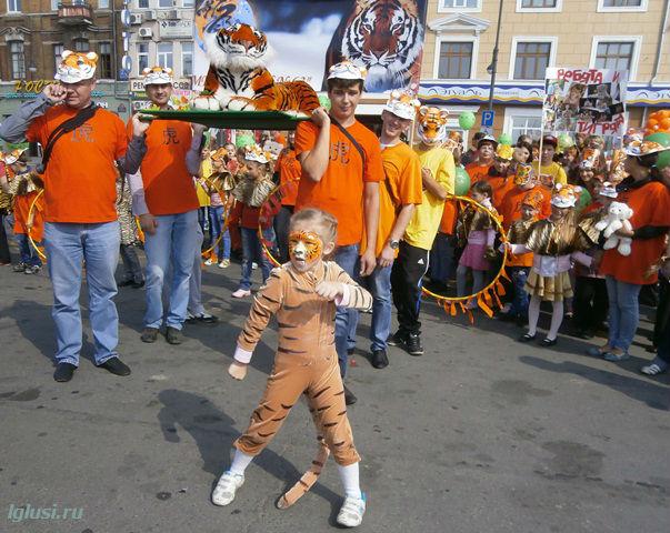 С утра колонны "усатых" и "полосатых" горожан , среди которых школьники, студенты, активисты молодежных организаций, коммерческие структуры и простые горожане, заполоняют городские улицы. Почти у каждого участника шествия есть тигриный атрибут — у детей усы и аквагрим на лице, взрослые не постеснялись нарядиться в забавные костюмы.