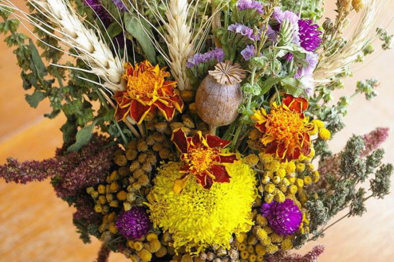 Такой букет называется «маковейчик», и в нем могут быть и бархатцы, и георгины, и астры, и гвоздики, и барвинок, а также разные травы: васильки, мята, чебрец, любисток, полынь, тысячелистник.