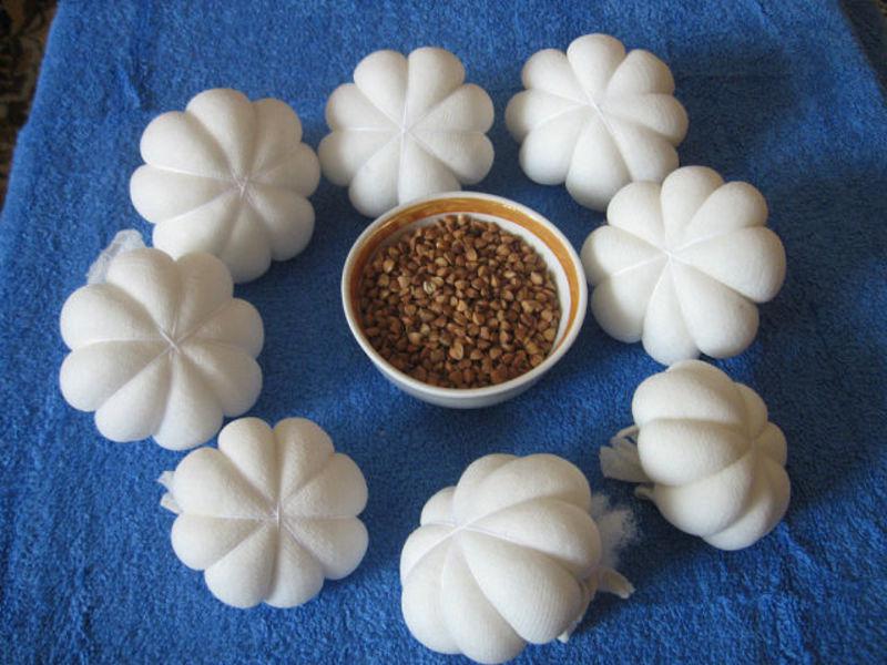 - Фиксируем нитку на узел, чтоб мешочек не развязался, лишнее отрезаем. В центр полученного чеснока капаем каплю клея, и фиксируем на нем крупу. Делаем 10-15 таких головок ( все зависит от размера чеснока и длины косички) Фиксируем на косичке чеснок, и все готово!