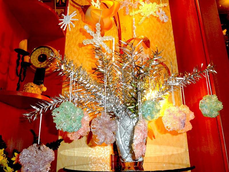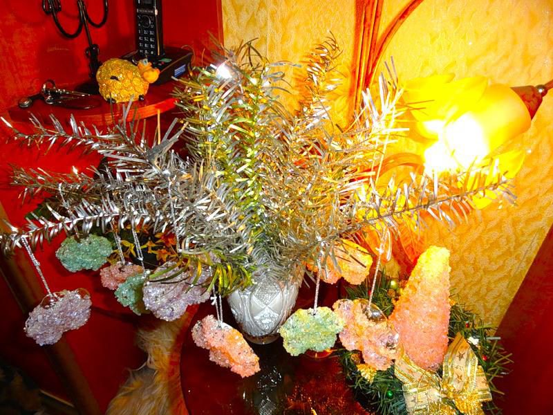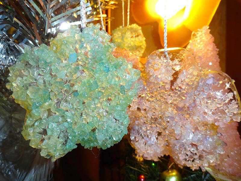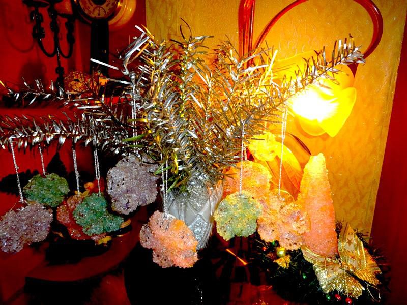 У меня была соль ТРЕХ цветов, поэтому понаделала разноцветных цветочков, и еще одну елочку успела!