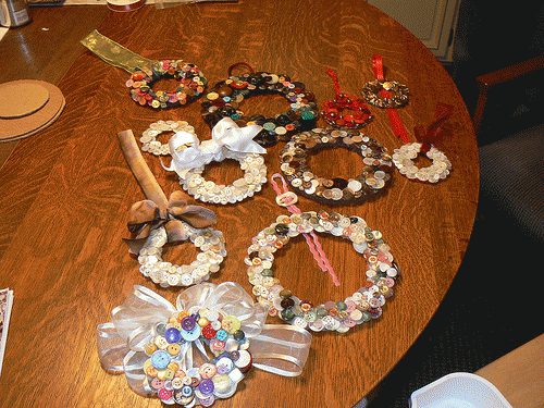 Материалы: много-много пуговок, основа, красивые ленты и горячий клей (термоклеевой пистолет)