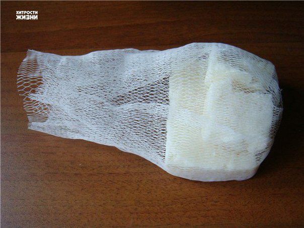 Как известно, после возни в огороде и починки автомобиля руки очень сложно отмыть. Здесь нам и поможет наша мочалка. Берем обмылки, помещаем их в сеточку, в которой продают чеснок в супермаркетах, завязываем и получаем мочалку, которая поможет быстро отмыть руки даже после самой грязной работы.