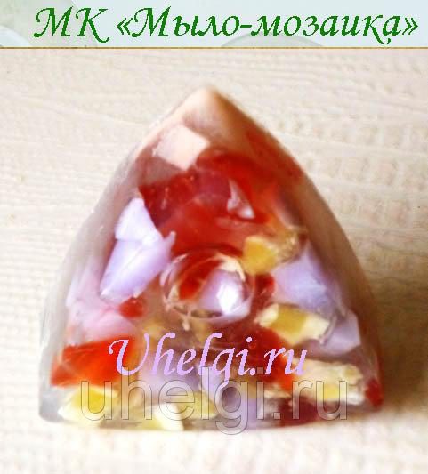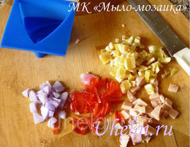 Можно натереть обмылки в стружку или нарезать кусочками, залить мыльной основой.
