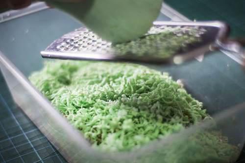 1. Натрите мыло на тёрке в ёмкость из нержавеющей стали. В результате должно получиться около 2 чашек тертого мыла.