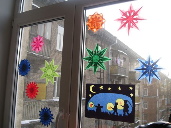 Из бумаги вырезать снежинки и при помощи мыла приклеить снежинки к стеклу.