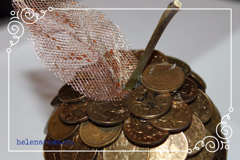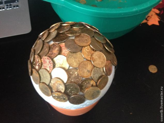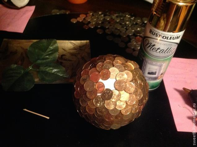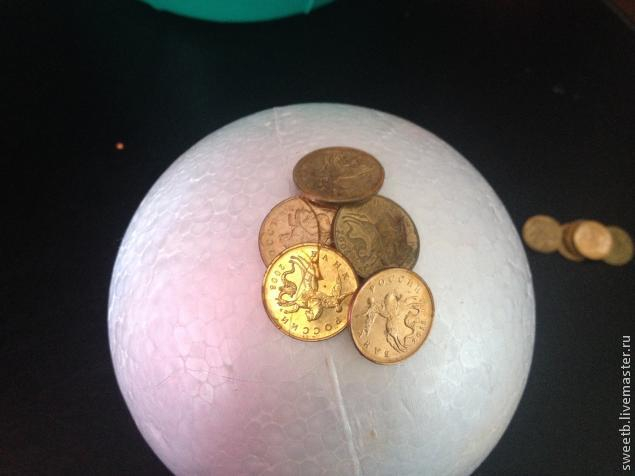 1) Берём наш шар и плотно обклеиваем его монетами, заходя монетами друг на друга. Если где-то остаются проплешины, не страшно, будем драпировать это в конце краской. Однако стараемся обклеивать максимально без пробелов.