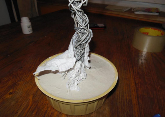 7. Затем приготовьте раствор из гипса (смешиваем гипс с небольшим количеством воды, доводим до сметанной консистенции) и залить им ваше деревце. По окончании шести часов затвердения гипса, можно приступить к дальнейшему декорированию композиции.