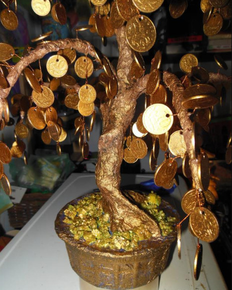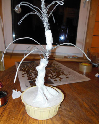 9. Осталось соединить полученные ветви и ствол в одно целое. Для этого поочередно прикладываем каждую веточку к стволу, аккуратно и туго обматываем лентой, а в конце покрываем краской и лаком и ждем до полного высыхания. Веточки с монетками можно прикрутить к каркасу как до установки в горшочек, так и после, как вам удобнее.