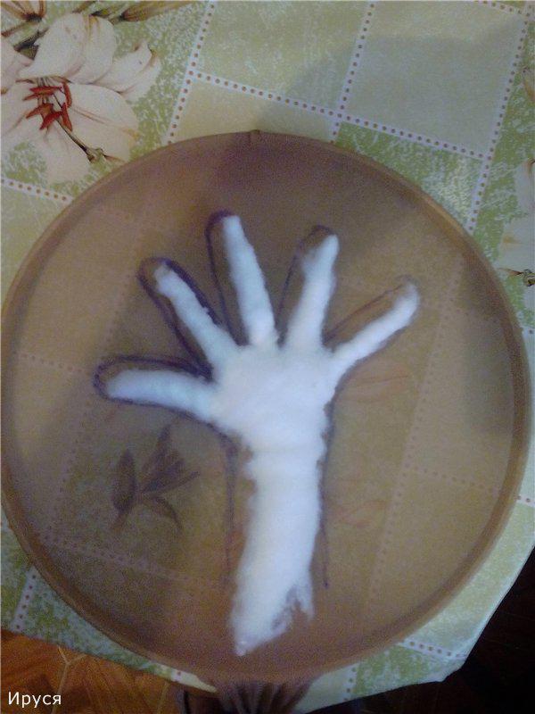 Натянула колготку на пяльцы и обрисовала ладошку. Потом прострочила, вырезала и поняла, что Бабка Ёжка может получиться мулаткой)))
