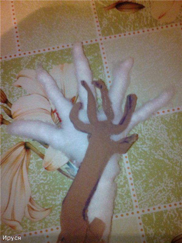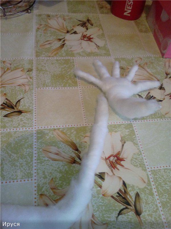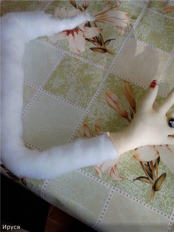 Большая белая проволока - это собственно рука) Все это обмотала сначала ватой, ( в целях экономии синтепона ), а потом синтепоном. Когда я делала Анфису, то все это еще приматывала нитками, теперь насмотрелась МК по валянию и получилось синтепончик слегка привалять.