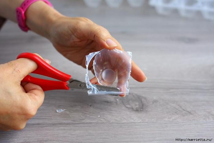 Для работы нам понадобятся пластиковые яичные лотки, ножницы и клей