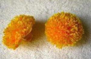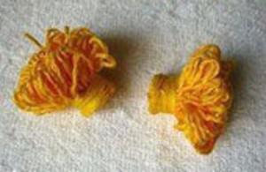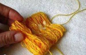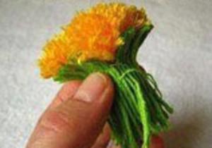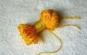 Толстую проволоку выгибаем в форме буквы П. Густо наматываем желтые нитки. По середине как бы прошиваем иголкой, тем самым скрепив нитки между собой, чтобы не рассыпались.