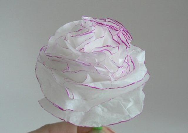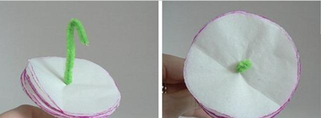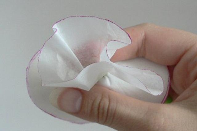 Начинаем с середины и так до последнего слоя бумаги. В середину бумагу сжимаем немного плотнее (ведь это же середина цветочного бутона).