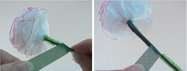 Теперь упаковочной (или гофрированной) бумагой обматываем проволоку, создавая стебель. Таким образом делаем каждый цветок.