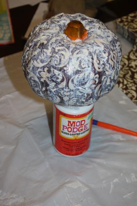 Принцип везде одинаковый, много писать не буду, по фотографиям все понятно. Вырезать узор из распечатки или отделить салфетку от слоев и нарезать ее на полоски, приклеить к тыкве с помощью клея для декупажа.