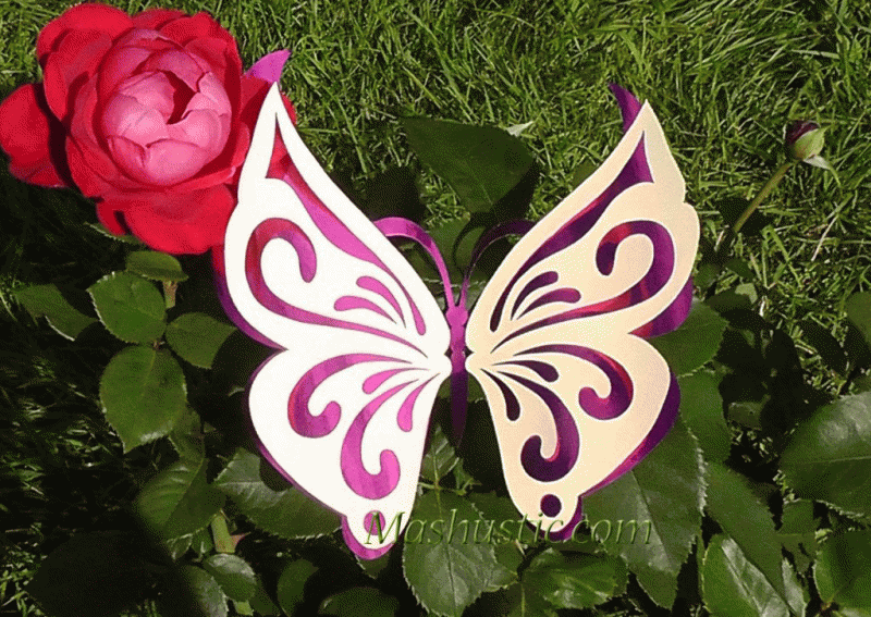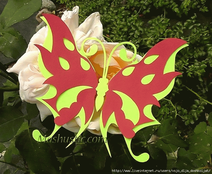 Такие чудесные ажурные двухслойные бабочки вы можете изготовить вместе с ребенком и украсить ими детскую комнату или подарить друзьям. Ребенок, если еще маленький, может вырезать более простой, нижний шаблон, ну а вы постараетесь создать красивый ажурный верхний слой.