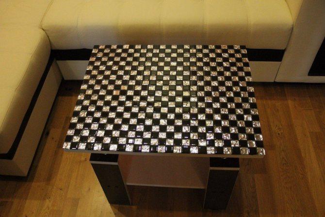 С помощью мозаики можно не только сделать журнальный столик уникальным, но и скрыть обветшалую, сильно повреждённую поверхность стола, появившиеся трещины и пятна. Мозаика также сделает столешницу более практичной — на такую поверхность можно ставить горячее и мыть любым способом. Кроме того, весь процесс не займет много времени и денежных средств.