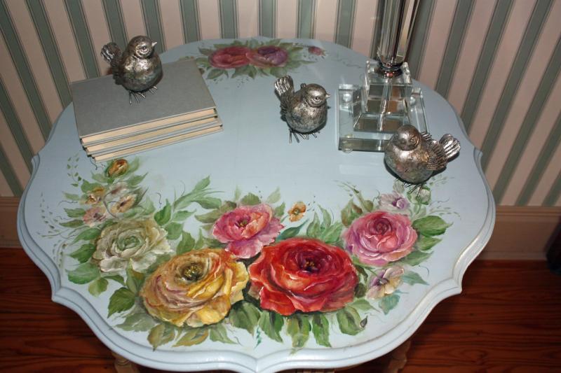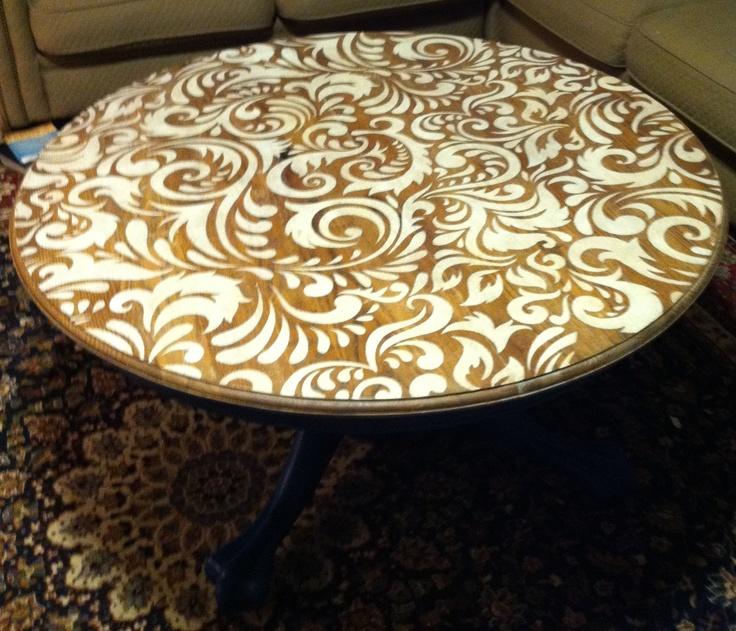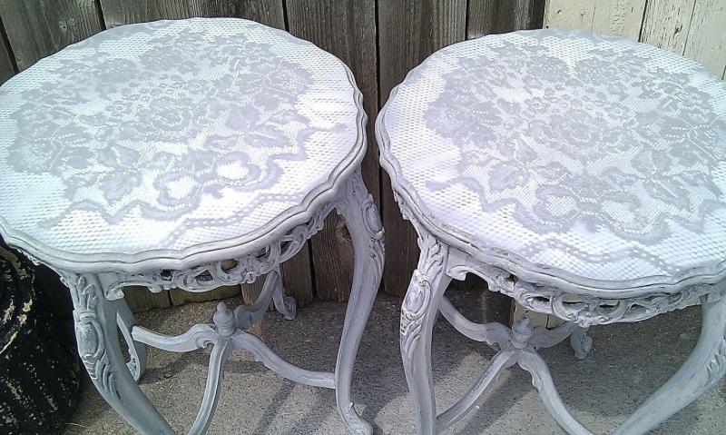 Интересным способом декорирования и покраски мебели является окрашивание через тюль – через нее красится столешница, и по принципу трафарета формируется кружевной рисунок.