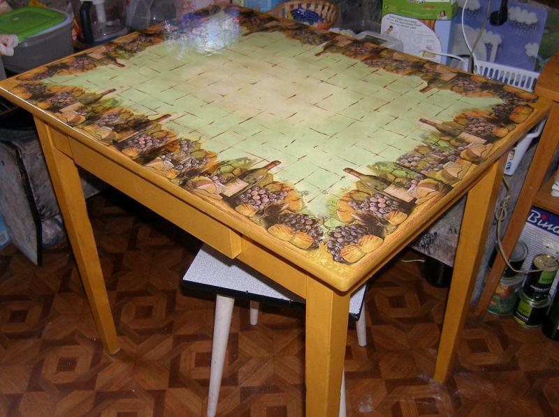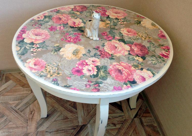 Очень красиво смотрится декорирование столешницы тканью, которую потом вскрывают лаком для практичности. Для тканевого декупажа хорошо подходят хлопчатобумажные ткани яркого цвета, имеющие плотное плетение. При помощи него можно создавать отдельные изображения или покрывать столешницу ярким сплошным изображением. Такой столик может стоять на лоджии, в беседке или террасе. Даже спустя годы он будет таким же ярким, как в самом начале.
