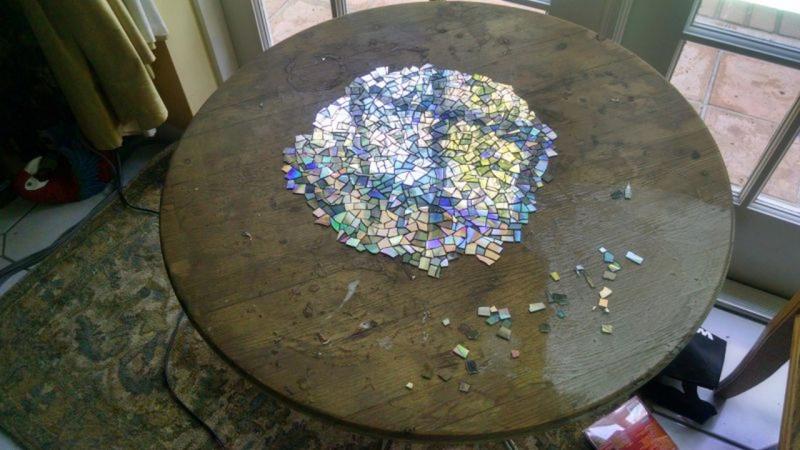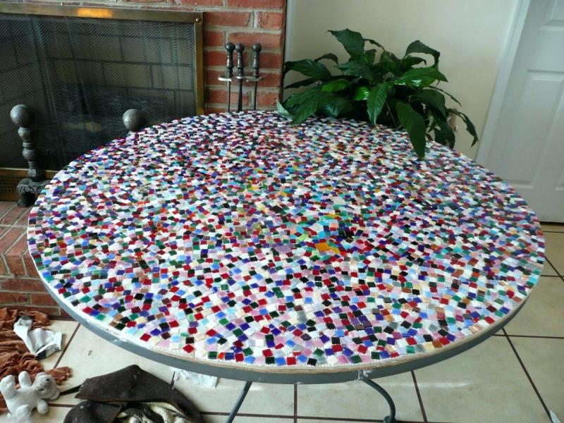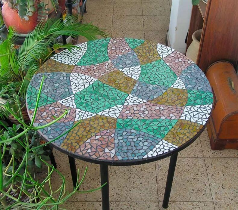 Мозаичный декор поверхности старого стола предполагает выкладывание узоров из различных материалов и затирку швов. Иногда мозаику закрывают стеклом или лакируют в несколько слоев, чтобы получить гладкую поверхность. В продаже можно найти специальные наборы из цветных квадратиков или кружков для мозаики.