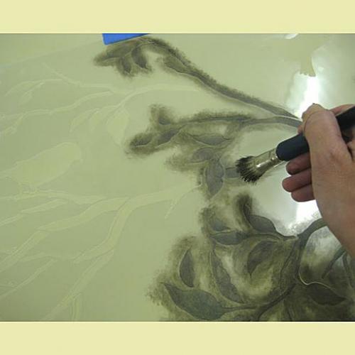 Насыщение рисунка цветом происходит постепенно, в несколько заходов. Если его границы получились недостаточно четкими, их прорисовывают тонкой кисточкой после снятия трафарета.